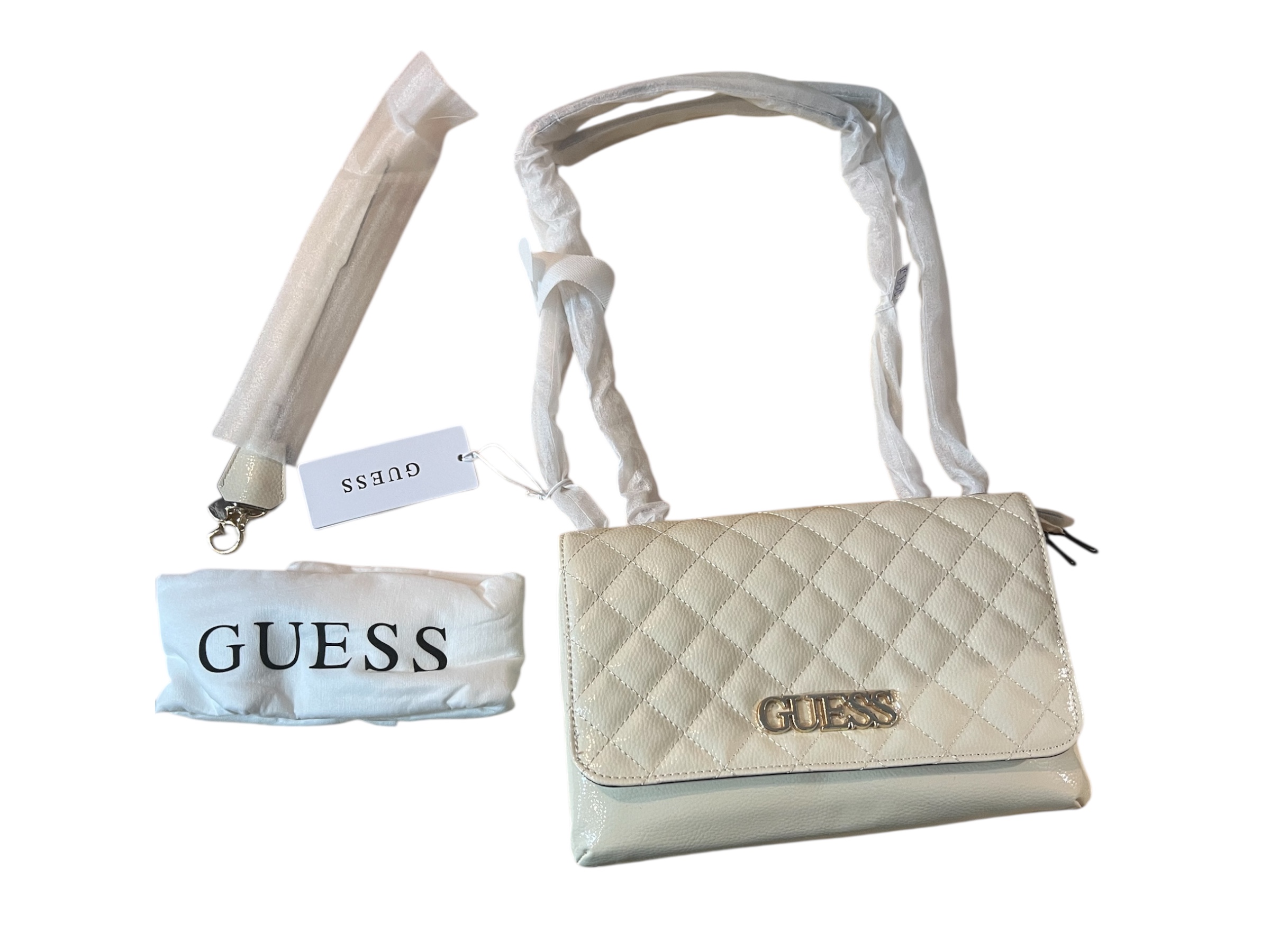 Piękna lakierowana torebka Guess HWARAZP1521, wewnątrz znajdują się dwie komory zapinane na zamek , dwie mniejsze otwarta kieszonka i jedna też mniejsza zapinana na zamek. Posiada worek przeciwkurzowy